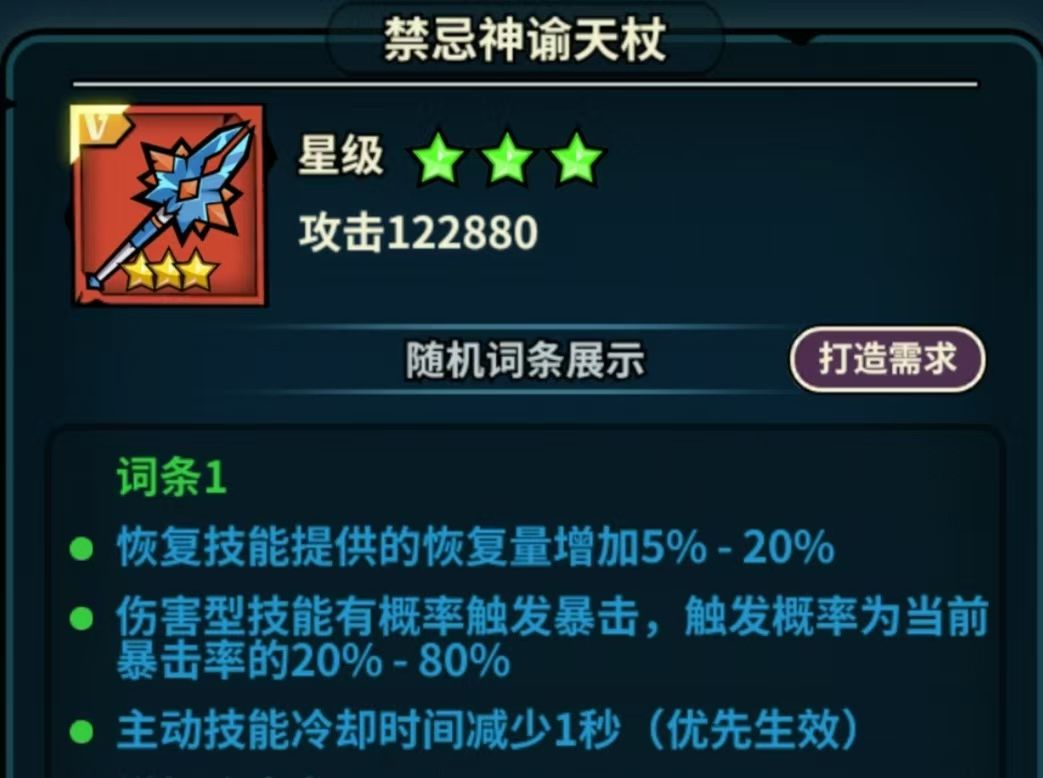 伤害型技能有概率触发暴击,触发概率为当前暴击率的20%-80%:这个通俗来说就是法爆,也就是可以使技能暴击(伤害型技能,奶妈不能暴击),好多人只看到20%-80%概率,实际概率是自身暴击率×(20%-80%),也就是百分百的暴击率,技能暴击率也只有80%,所以想使用该词条一定要足够的暴击率(法杖)