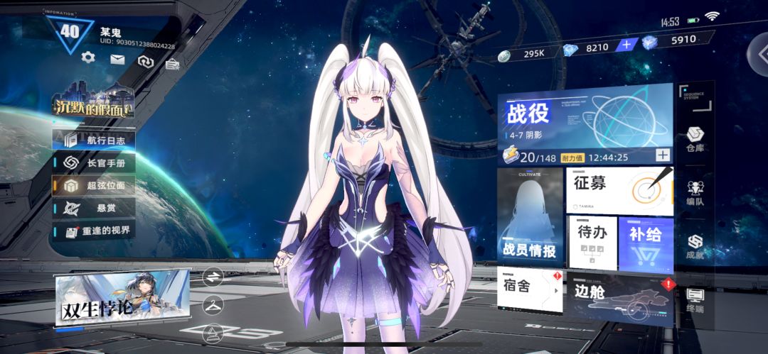 首先对游戏内日常界面做一个概述,如下为游戏主界面,每天登录就是在这个地方跟你选中的助理战员见面~左侧为日常奖励及活动入口,右侧为主线关卡、抽卡商店、养成收菜等常规区域。(图中战员为游戏看板娘一松樱)