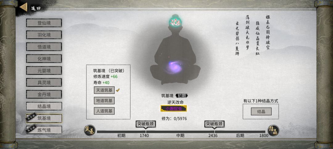 如果带了『莲心剑意』玩软饭流,就到处走走,采灵气→出现重塑肉身的莲子→筑基后期前往主城→出门并加速→等3-7年→触发剧情