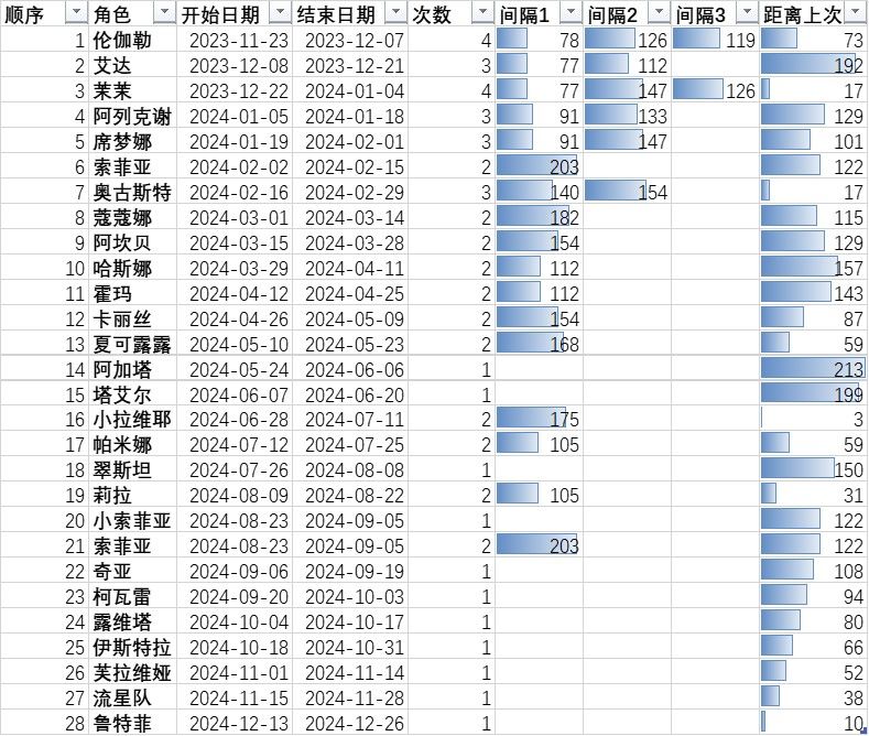 首先来看看各个初遇角色的复刻情况。(均根据卡池开始的时间计算)(没有统计开服版本的角色,即没有单up角色的重逢)(更正了席梦娜、小姐头的统计错误,如有其他错误欢迎指出)