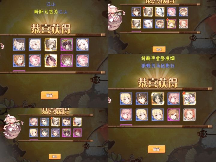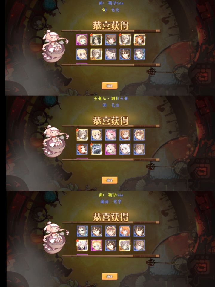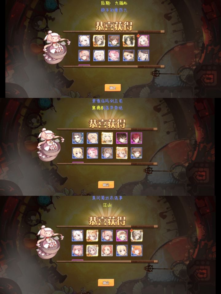 上次下SP的池子还是上个新出的SP的时候,然后就退游了,这次看到姜饼好漂亮,斯哈斯哈的回坑了。前三张拼图是渠道服的五个账号,都是这次UP池子的。后边姜饼,我惊了,我当时只是拿5个5个抽的。然后每次都有一只,我当时看着20%陷入了沉思。姜饼我就纯是凑图鉴,因为还没试试咋用,抽完一个就去抽皮肤了,运气挺好,三十抽出了皇帝动态皮,但是我没有皇帝松饼啊!天杀的,我老喜欢这个皮了!后边的3抽几乎是阴暗爬行嘶吼着:我要松饼,我要皇帝松饼!!!
