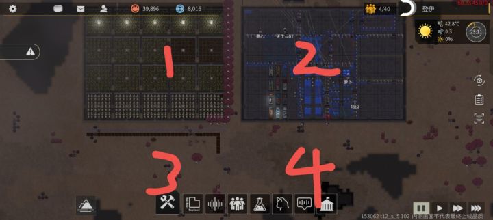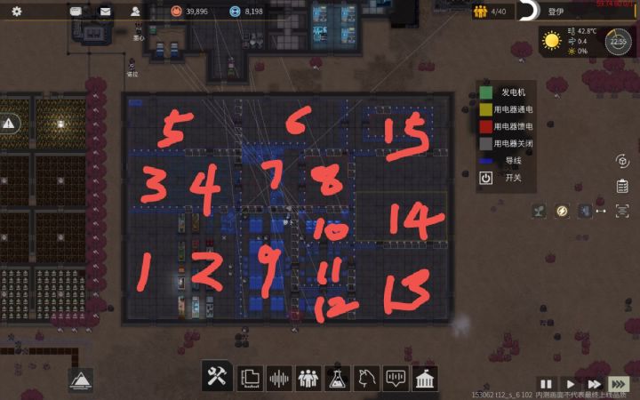 1.原料区,2.工厂,3.药品食物,4.储物箱(装备),5.畜牧区,6.钓鱼存储区,7.发电,8.垃圾,9.休息,10.医疗,11.餐厅,12.娱乐区,13.家具存储区,14.运输区(+空艇,贸易),15.尸体区