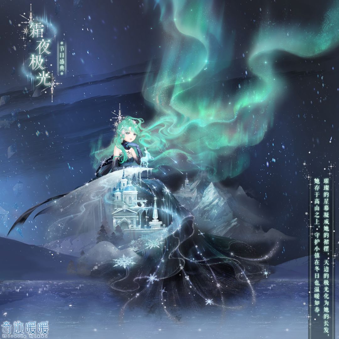 【霜夜极光】含正常姿势与特殊姿势,全新妆容“银河遥望”,冰雪面饰“霜雪莹华”,流动极光特效发型“流光若梦”、“极夜流光”,精美可移动摆件“霜雪圣殿”、“绵延冰峰”。