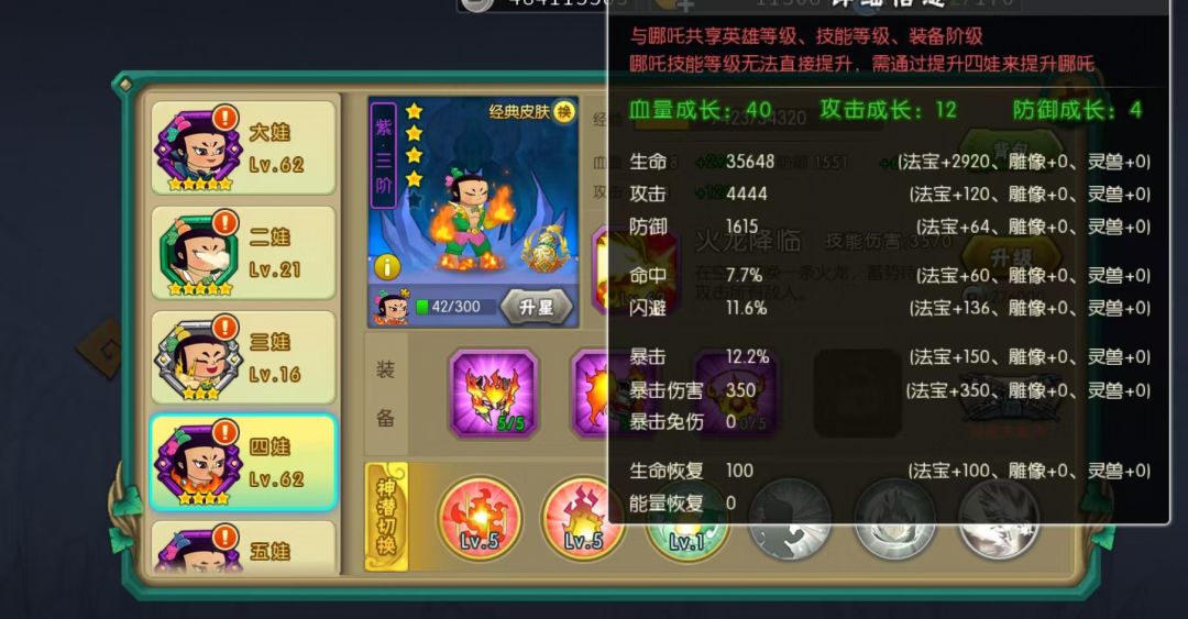 怪物情况,一只雪猿加俩只减速小蝙蝠,无增援。可以同步第一关,開局四娃技能要快速消灭蝙蝠,保证五娃血量就行,最后留四娃技能到第三小关。
