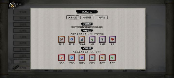 还有一种是大妖兽,这些是筑基突破的材料,大妖兽会刷在固定的格子上,打了掉红色六道精气,突破的时候没有的话可以自己刷小怪掉碎片合成,这些材料不影响属性,只影响成功率(运气的重要性)。还一种是天材地宝(图三),这些有具体属性加成。筑基基本是三样金,之后会有不同的可以选,具体的升级流程就这样。