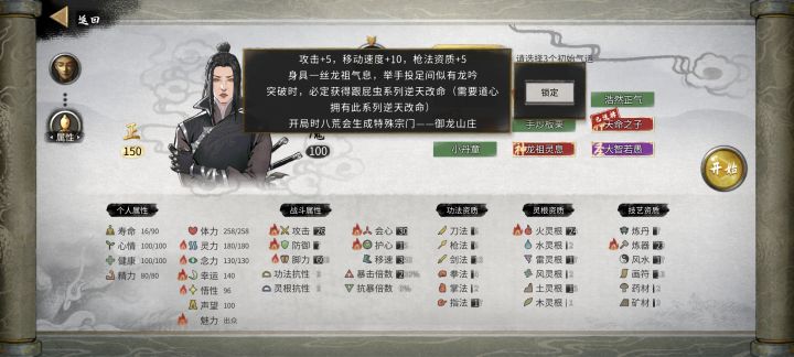 首先是建档d天赋,这里比较简单,因为大部分红色天赋都是白给,并且资质可以后天刷,所以只关注人物面板属性即可(见图2),悟性不低于80,幸运尽可能高。有新版加的金色天赋就选金色,没什么好说的,纠结d天赋的时间不如早点开游戏。这里有个比较特殊的红色天赋祖龙。基本和大部分红色天赋一样属于白给,但是可以召唤小龙女/小龙男(好看,好玩)。低难度玩一玩还是可以的,并且送白送宗主(比较重要)。其他的比如颜值,这个影响npc对你的关系,可以靠坐骑叠,长的太好看过月的时候会有很多人找你说话,非常麻烦,长的丑没试过, 应该容易挨骂。不嫌烦无所谓,如果是顺手牵羊圣体经常开摸建议卡普通。