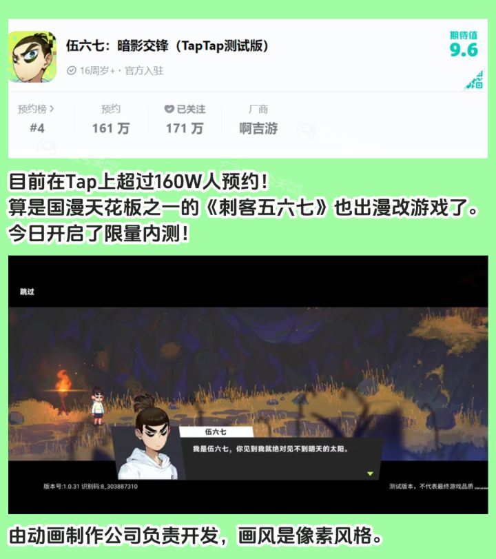 在Tap上超过160W人预约的手游开启内测!国漫天花板之一的伍六七IP作为横板格斗游戏登上了移动端游戏平台,这次内测表现总体来说还不错!