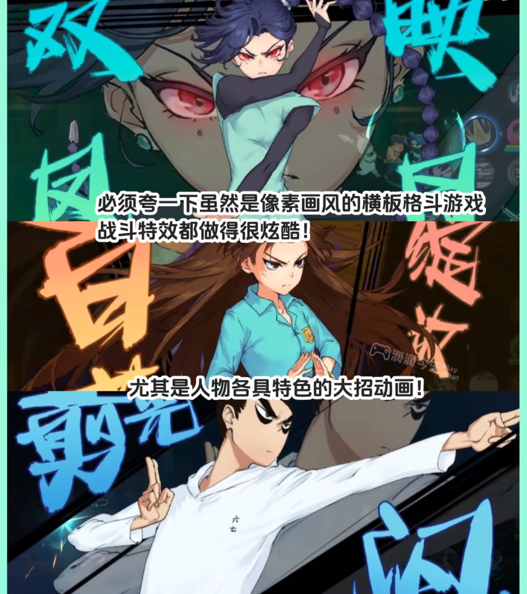 画风上必须夸夸,虽然是像素风格,但是高饱和度,整体鲜艳明亮的风格一眼讨喜。不少过场丝滑衔接了原作剧情动画。而在核心的动作格斗上,设计了气势条累积,反弹等操作,也让游戏比普通的横板闯关更有操作空间。