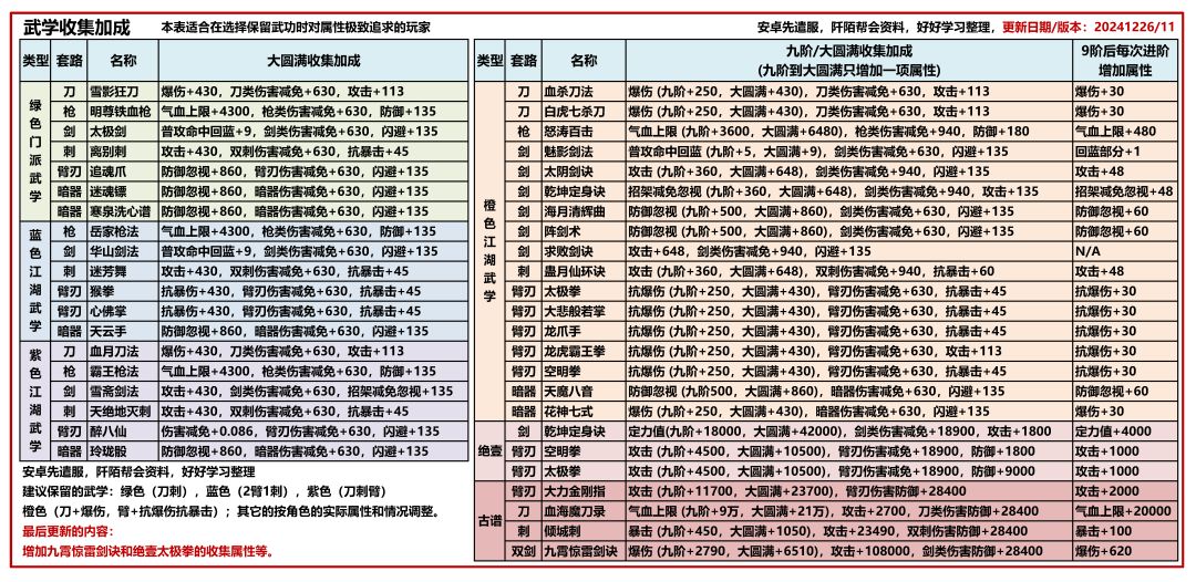 玩过九阴3D的玩家都知道,这个手游是一款集几十种武学的游戏,玩家可以随便搭配已经学过的武学,但是游戏内设置武学上限是30个,那么自己所学的武学超过了30个之后就必须遗忘不玩的武学了,那么遗忘哪些武学呢,每种武学都有自己的收集属性,玩家可根据下面的图自己做好选择
