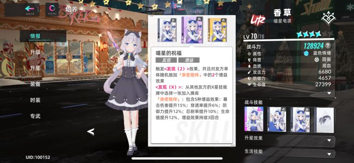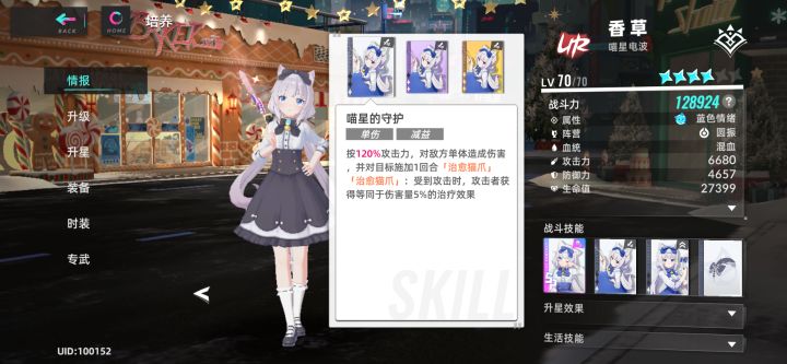 首先不论是巧克力还是香草,如果想常驻队伍使用的话都是有必要满星的。如果资源不够的话可以优先抽香草,香草的辅助性比较好,泛用性远超巧克力。香草的泛用性主要体现在6星效果,每回合开始能给全队随机添加一个增益效果,且优先添加未获得效果,虽然没法固定增益效果有点儿凭运气,但是在多回合战斗中,总能稳定上到攻击相关增益,属于没有太大限制的增益。另一个泛用的技能便是香草的核心技能,带有发现与增益效果的【喵星的祝福】,搭配一星效果,战斗开始时能给一张【喵星的祝福】升一次星,也就是说开局就能稳定发现任意一张两星卡,能更快触发其他角色的两星和三星卡效果。要算缺点也就发现卡自身在战斗时就要占用一个卡位。大招为全队提升26%攻击力2回合加驱散对方全体三层增益。【喵星的守护】给对方单体挂一个【治愈猫爪】的效果,一星卡持续一回合,二、三星持续两回合,携带者被攻击时恢复攻击者伤害量5%的治愈效果。香草其余的辅助增益皆需绑定蓝色情绪队友,在专武与星级都满的情况下总共能获得所有蓝色情绪友方忍耐率12%、暴击率11.2%的常驻增益,只要香草存活在场上,效果就是永续的,有香草之外的猫娘乐园角色存在时,全队受到治疗还能提升12%,装备方面推荐幸运套和忍耐套,幸运套能加快香草出两星卡的几率,忍耐套则是在香草生存压力较大的环境下使用。总结:香草属于目前为止少见的较为全能的辅助,除了护盾方面增益和友方负面效果驱散没有之外,其余几乎都有点儿。香草在蓝队中,且有其他猫娘乐园角色时效果能最大化,但在杂色队中仍能有不错的辅助效果。在猫娘乐园联动中抽取的优先度较高。另外联动角色统一有个小缺点,就是皮肤少,后期其他角色皮肤出的多的话,在基础数值上就会产生一定的差距。
