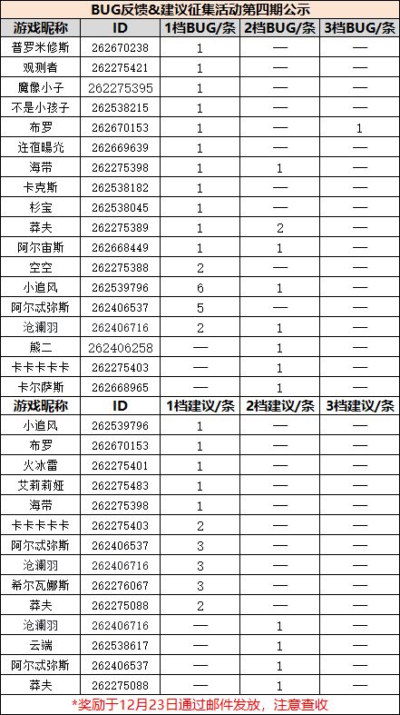 第四期建议反馈活动获奖玩家名单如下,奖励我们于12月23日通过游戏内邮件发放。我们会认真对待每一条建议。请放心,勇士的建议将随着每次版本更新逐步实施。