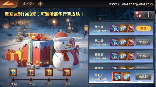 参与冰雪豪礼每日累充,可得大量养成资源、抽奖券以及基地装饰——冰灵企鹅!1.达成每天累计充值不同额度,即可领取当天累充奖励