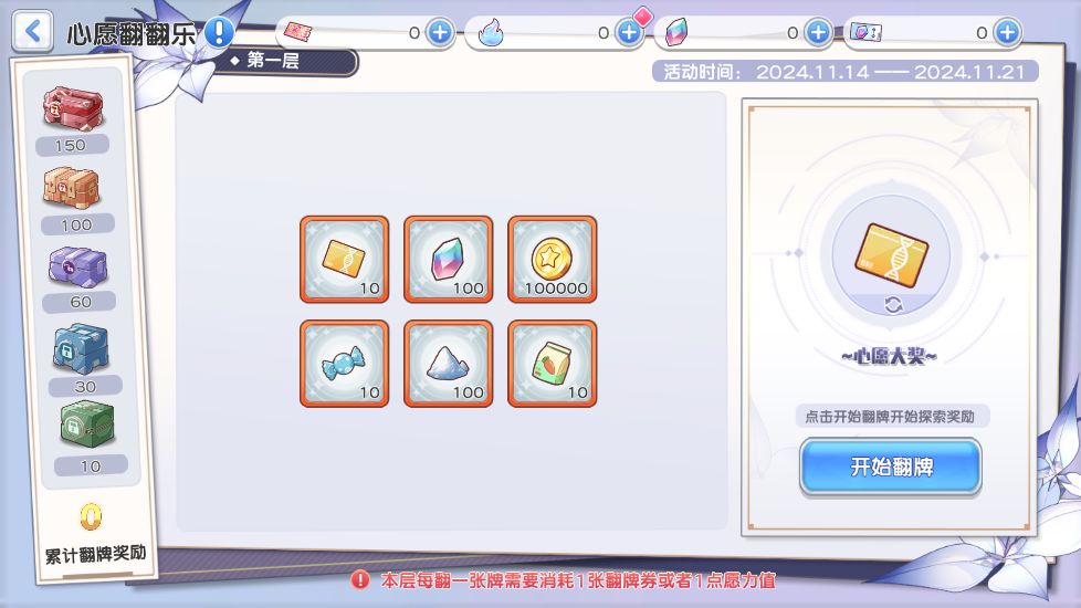 - 活动期间,消耗指定道具可兑换翻牌券,完成活动任务可获取愿力值;