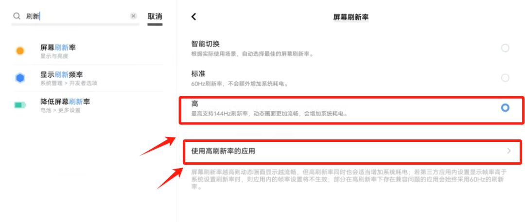 在【屏幕刷新率】下滑至【高】并开启-点击【使用高刷新率的应用】。