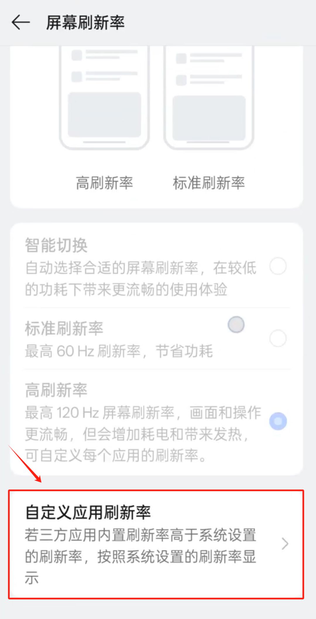 点击【屏幕刷新率】-下滑至【自定义应用刷新率】
