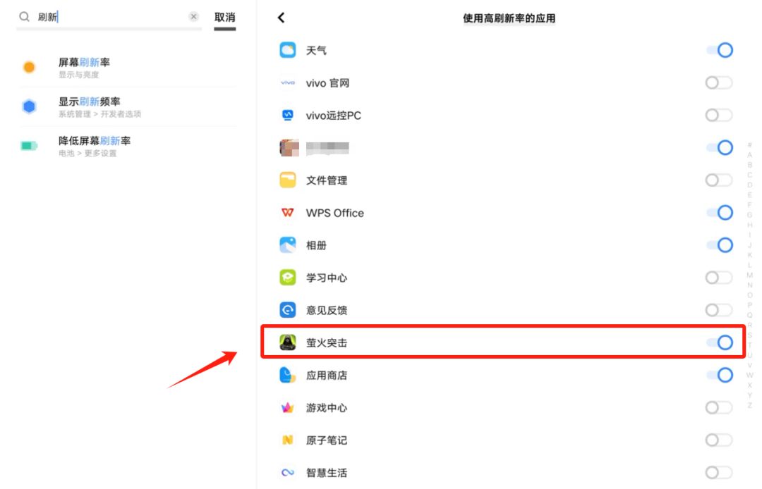 进入【使用高刷新率的应用】-下滑至【萤火突击】-点击开启即可设置完成。
