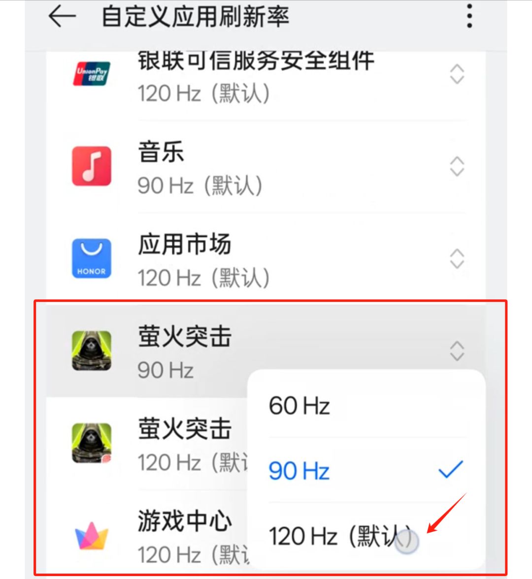 点击【自定义应用刷新率】-下滑至【萤火突击】-点击【萤火突击】,选择【120Hz】即可设置完成。