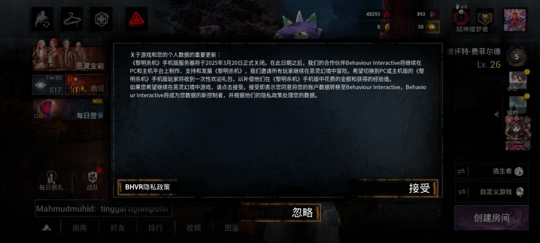 黎明杀机手游即将关服了,趁着还没下架圆梦