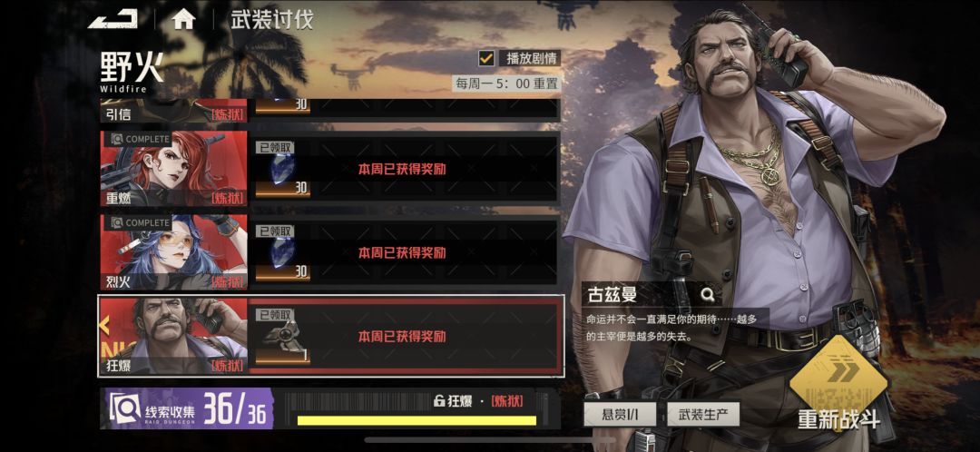 第四关boss有点难打,借了工会大佬的满命满瓶彩甲黑洛莎,第二轮芙烈达需要开负载强袭,玛丽把buff传给黑洛莎,马库斯的走位也很重要。上场阵容:玛丽(5命/彩马尔萨斯/7+16/出力协力背包/彩双枪和单彩火箭/鞭策、军事指导、侧翼火力、弹道收束改)、黑洛莎(5命/彩复仇女神/7+16/彩双机枪+诸神黄昏/醒梦、巅峰极诣、超容火力、弹道收束改)、马库斯(3命/彩2号机/1+16/飞行破甲背包/破袭、骁猛、振奋、增压射击改)、芙烈达(3命/彩暮色/16+7/破甲移动背包)、罗娜(1命/金1奥德修斯/7+1/马哈力姆之力)。