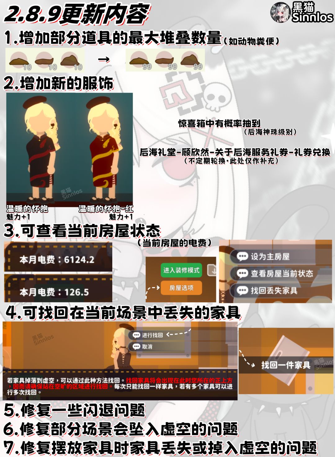 更新啦!~ (2.8.9版本)更新内容:1.修复一些闪退问题2.增大部分道具包括动物粪便的最大堆叠数量3.修复部分场景会坠入虚空的问题4.修复摆放家具时家具丢失或掉入虚空的问题5.增加新的...