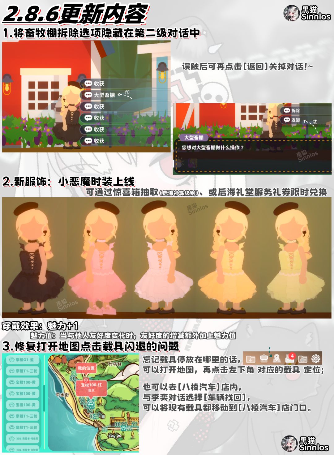 [小生活-悠闲小镇物语]更新啦~ 2.8.6版本上线!更新内容:1.将畜牧棚拆除选项隐藏在第二级对话中2.新服饰:小恶魔时装上线穿戴效果:魅力+1(魅力值:当与他人友好度变化时,友好度的增减...