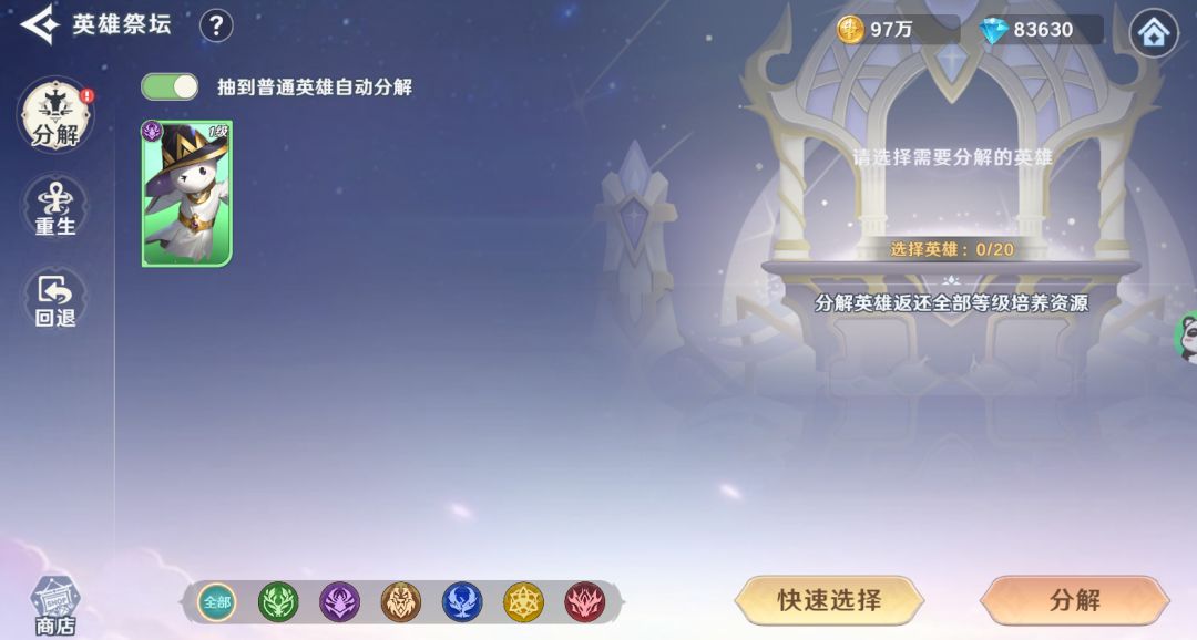 1、普通英雄可进行分解,分解后英雄将消失,获得一定数量的突破石及分解币。