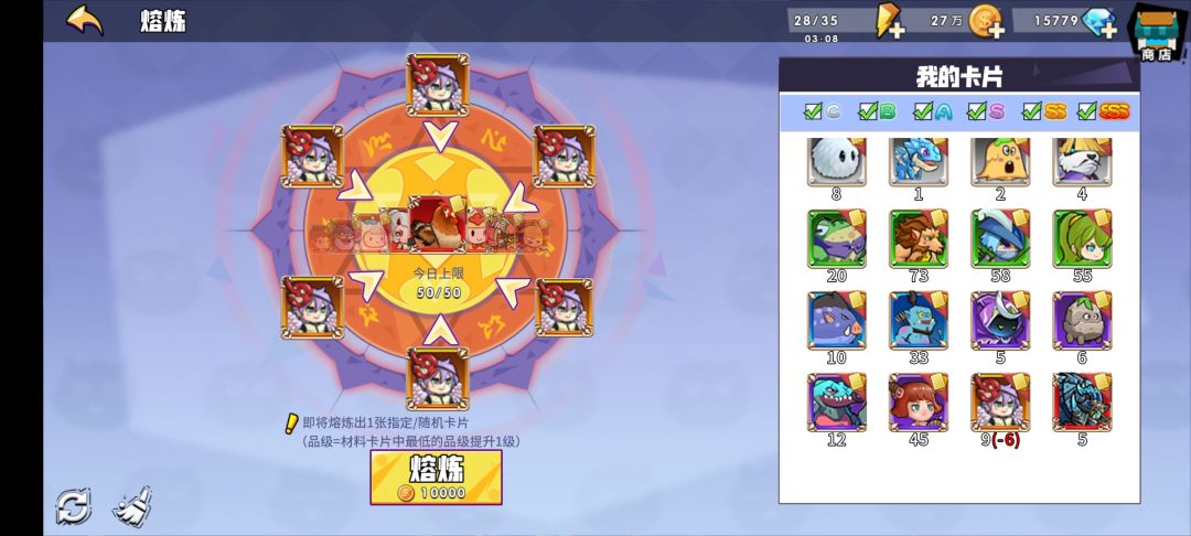 1.先过第十关冒险,设置先打开“不自动激活可合成家族” 避免橙卡碎片不够用