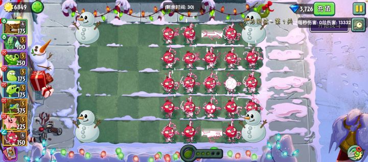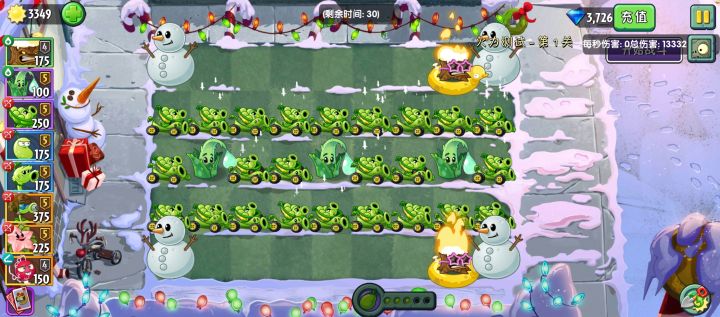 萌新想拿满奖励只要有任意一种板栗(冰的,电的)冰的更好可挂机,电的手快点废了,把不无敌的雪人清掉就有12、3W了,30S(6X2豌豆射手能射20发20伤害的豌豆)加紫火炬4倍为1W92,都差不多到15W了