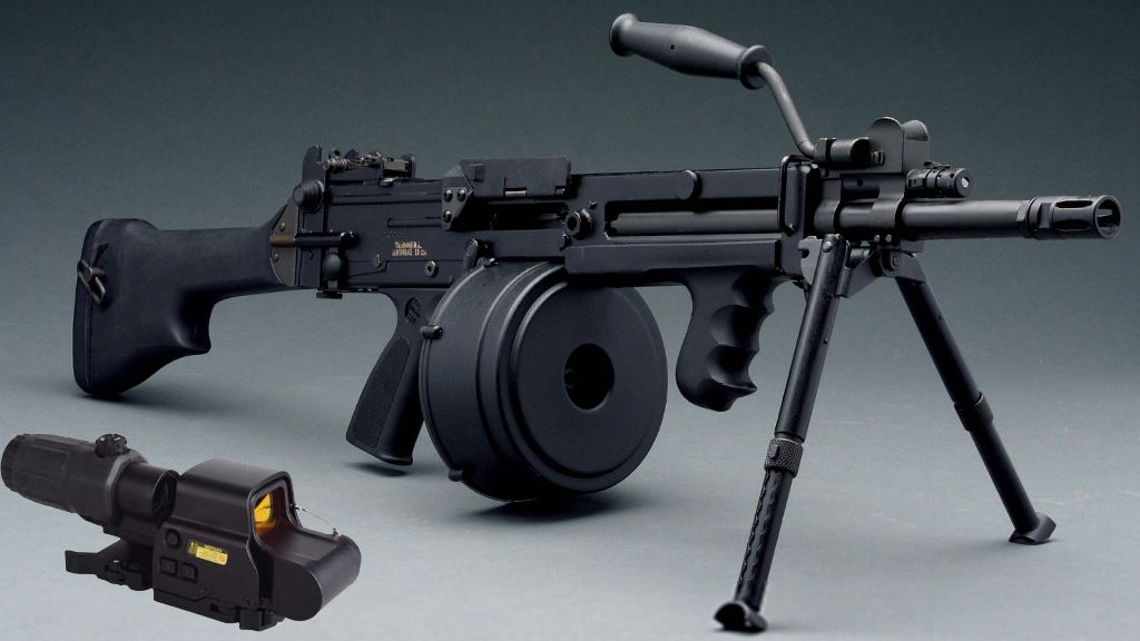 该枪配备20英寸重型枪管,子弹初速高;自带100发弹鼓、自带握把、自带三倍全息组合瞄准镜(不可拆卸);基础后坐力极低,并可安装枪口配件来进一步改善后坐力;前部自带两脚架,趴下可大福降低后坐力。