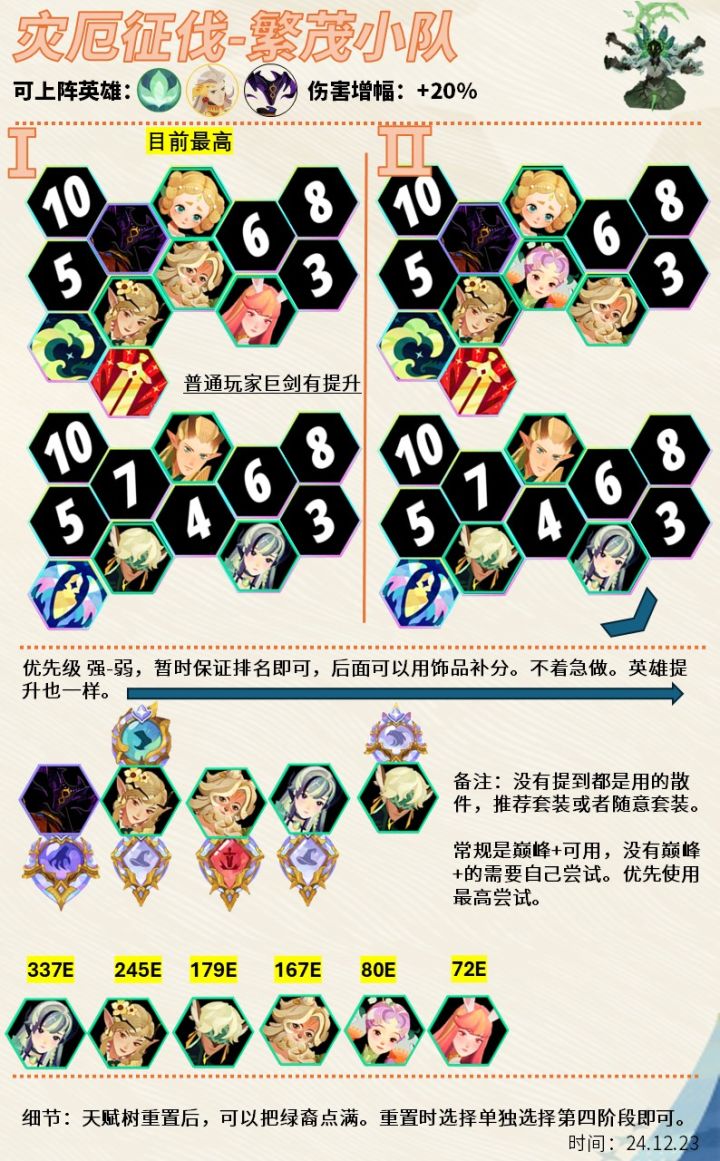 1.灾厄细节:想高分就重置天赋,把绿裔点满。第一天保持排名即可。女神装备优先输出,精炼可以暂时不用,后面补分。(每个人英雄不一样,装备不一样,建议多尝试),普通玩家五人队,使用巨剑术,伤害有提升