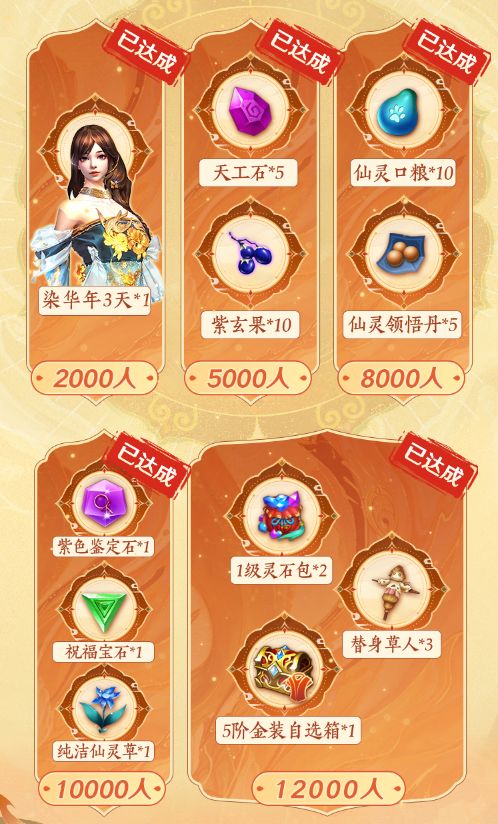 本次大服预约截至开服已突破至最高阶段!入驻大服就可收到包含5阶金装自选箱奖励的大服预约大礼包!
