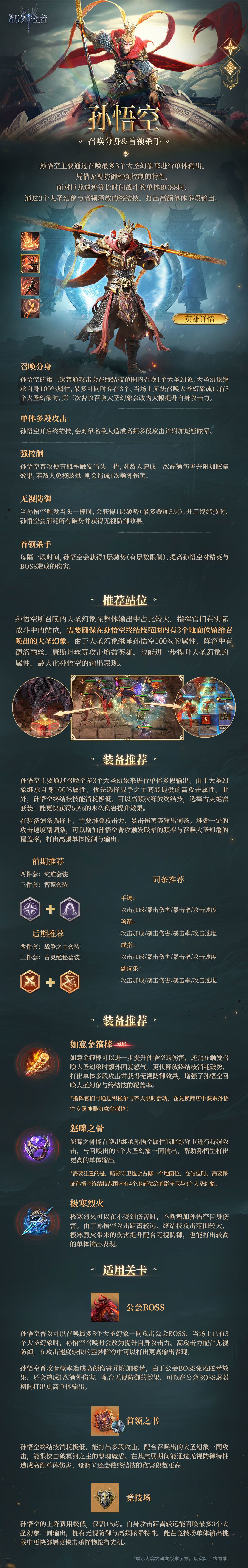 孙悟空主要通过召唤最多3个大圣幻象来进行单体输出。凭借无视防御和强控制的特性,面对巨龙遗迹等长时间战斗的单体BOSS时,通过3个大圣幻象与高频释放的终结技,打出高额单体多段输出。更多孙悟空攻略详情请戳下图↓↓