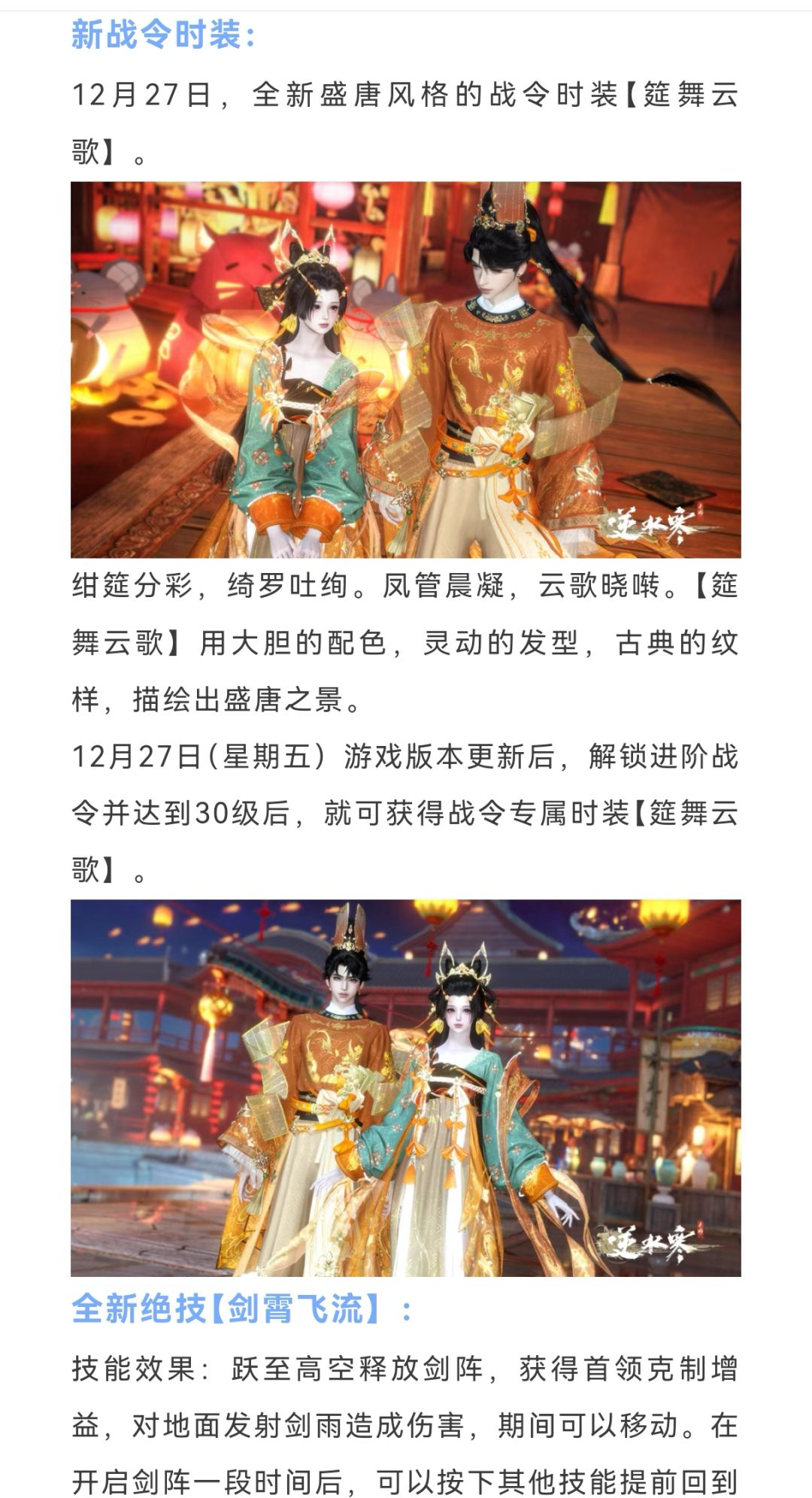 新战令时装爆料,明年版本更新计划,本周六新时装提前看,新增萌宠技能,新绝技获取,两款新内功!