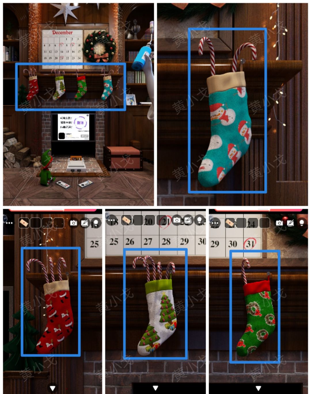 🔶袜子上的图案及里面的拐杖数量:圣诞老人-3、圣诞树-4、圆环-1、雪人-2