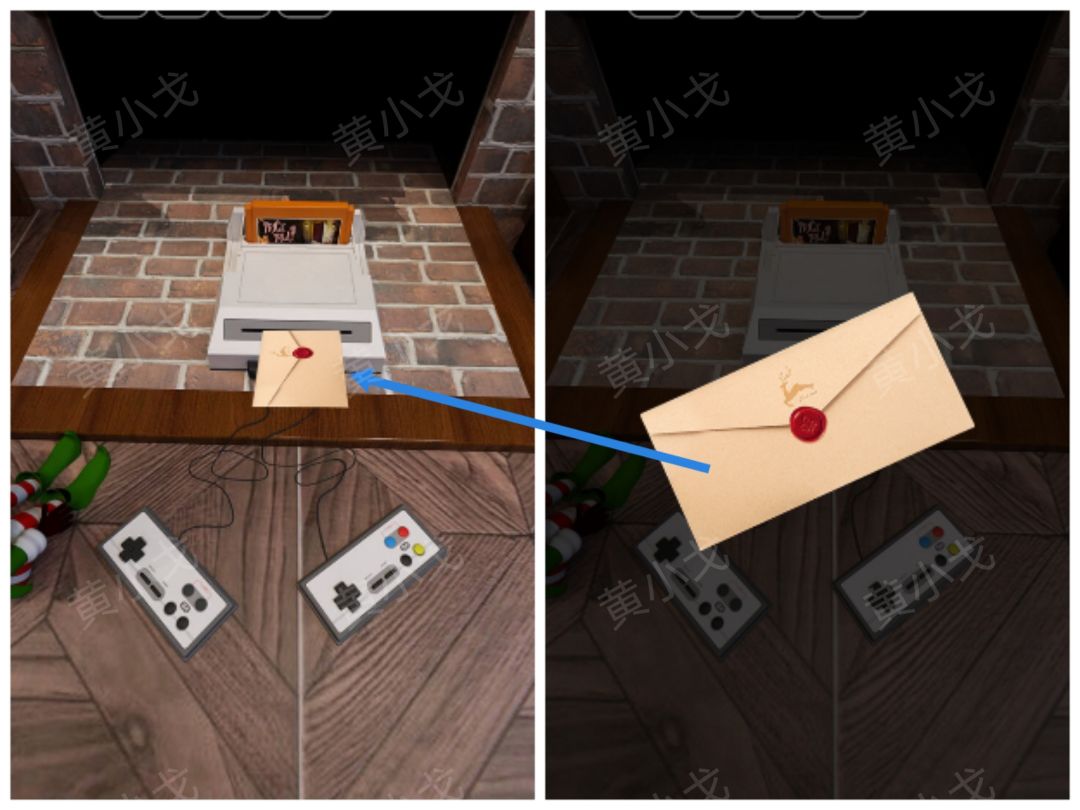 4.点击地上的右侧游戏机手柄,根据[圣诞老人]场景驯鹿鼻子颜色线索,按顺序点击对应颜色的按钮