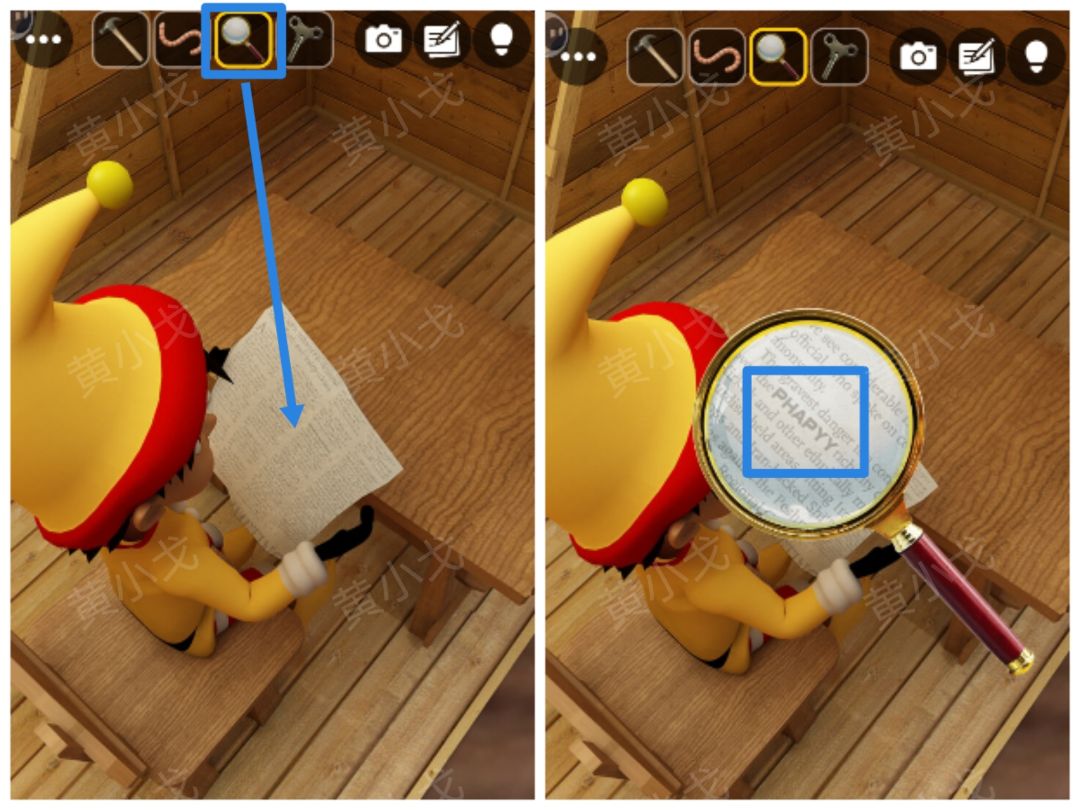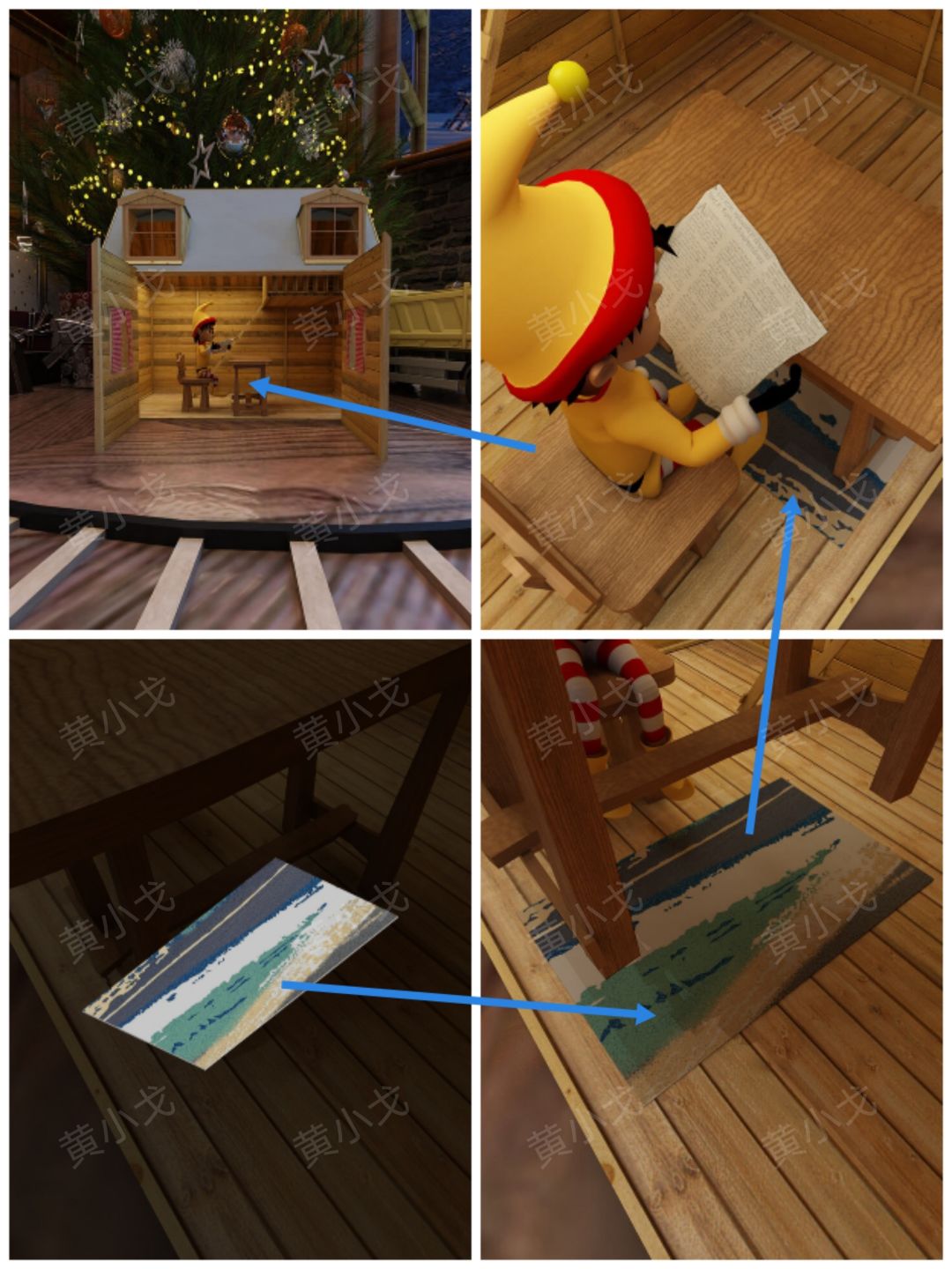 28.点击圣诞树前面的木屋模型,用【放大镜】查看小精灵拿着的报纸,获得线索