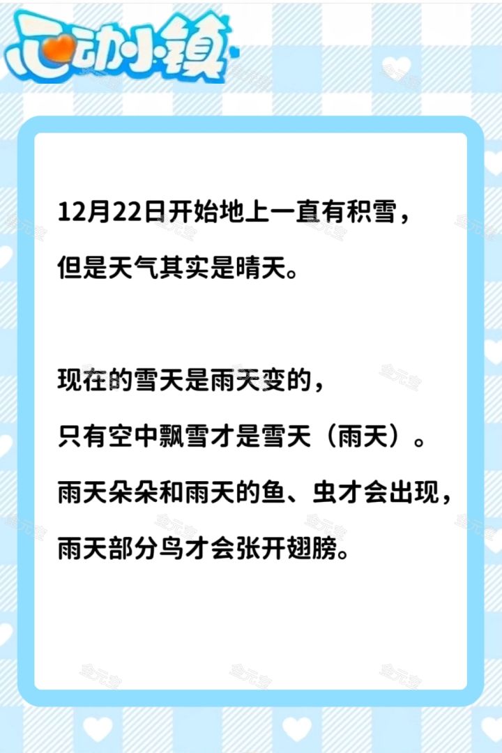 现在的雪天是雨天变的,只有空中飘雪才是雪天(雨天)。雨天朵朵和雨天的鱼、虫才会出现,雨天部分鸟才会张开翅膀。