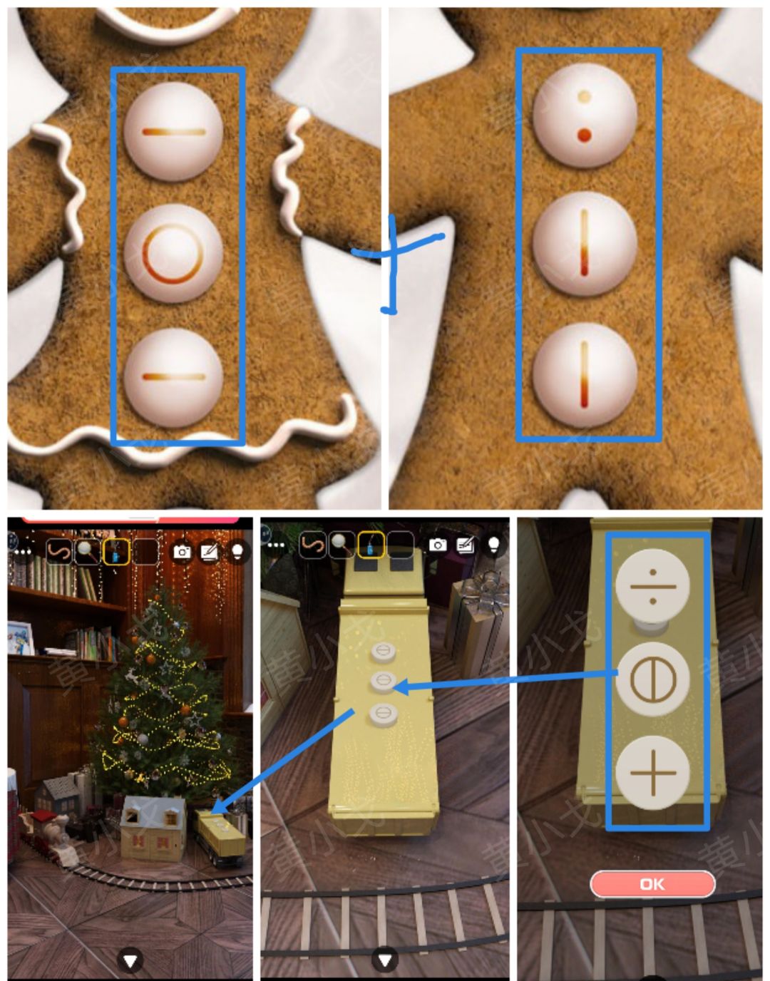 31.点击火车玩具笼子上的密码锁,根据上面的提示,结合各场景圣诞花环里面的图案,调整密码锁