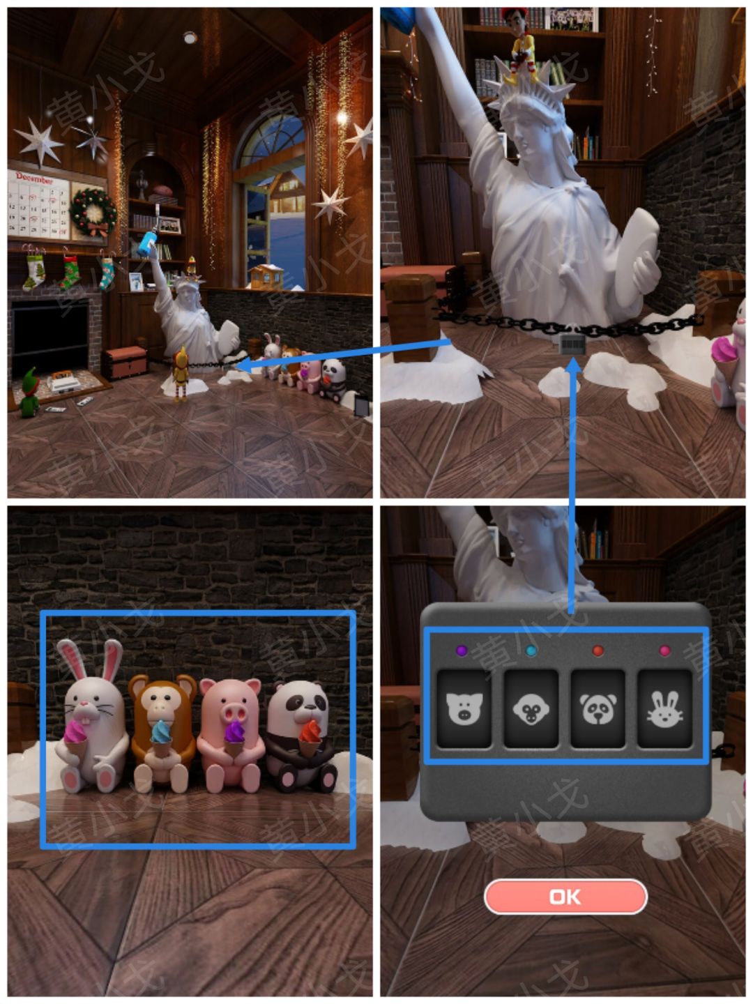 6.点击自由女神像前面铁链上的密码锁,根据上面的提示,结合动物玩偶线索,调整密码锁,打开锁链