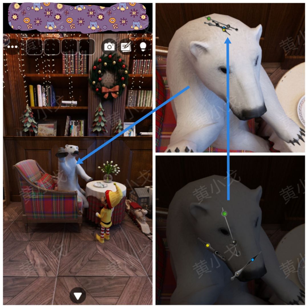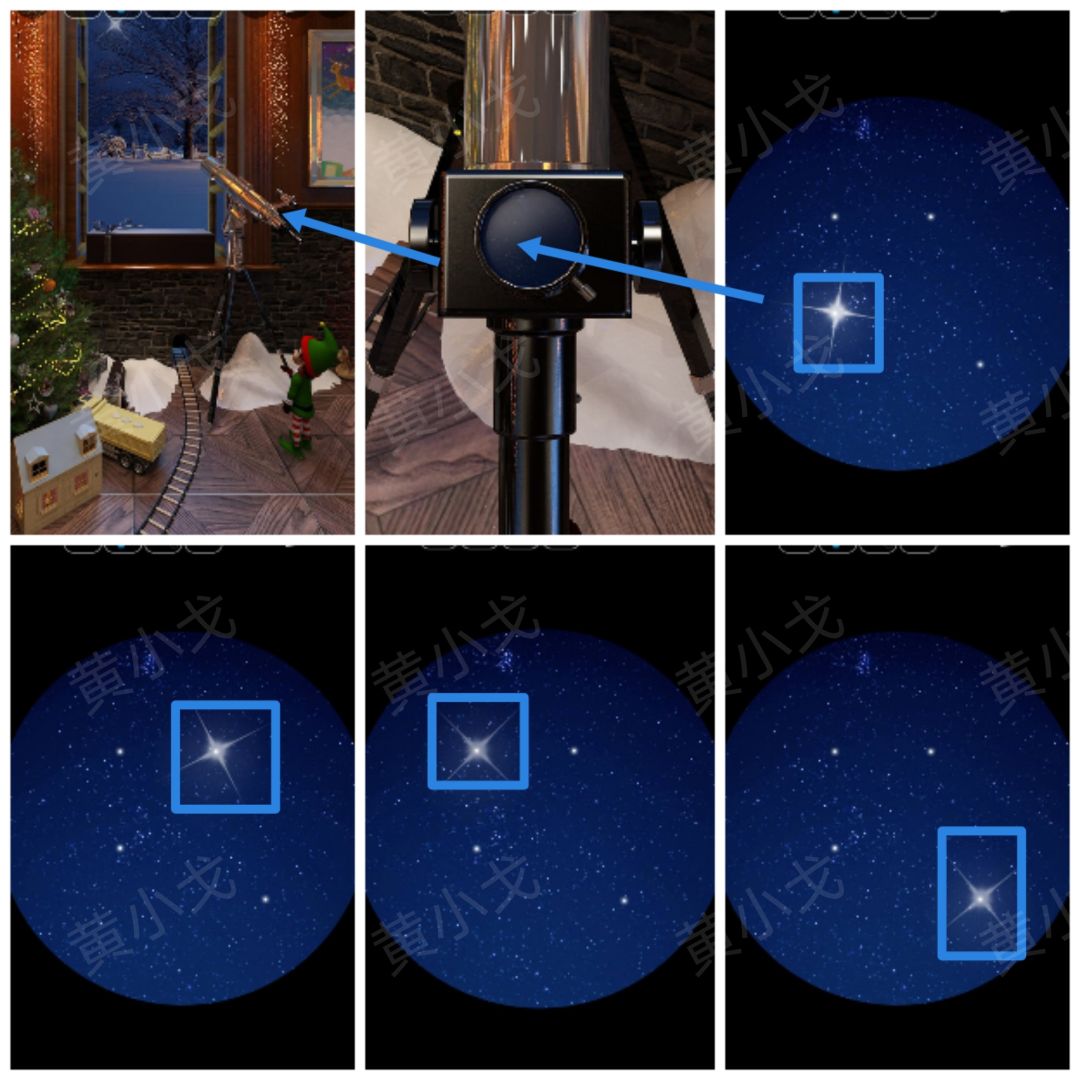 🔷根据[女神像]场景窗台上的小木屋方向指示,得到各场景的东南西北方向;每个场景对应的圣诞花环里的图案就是答案