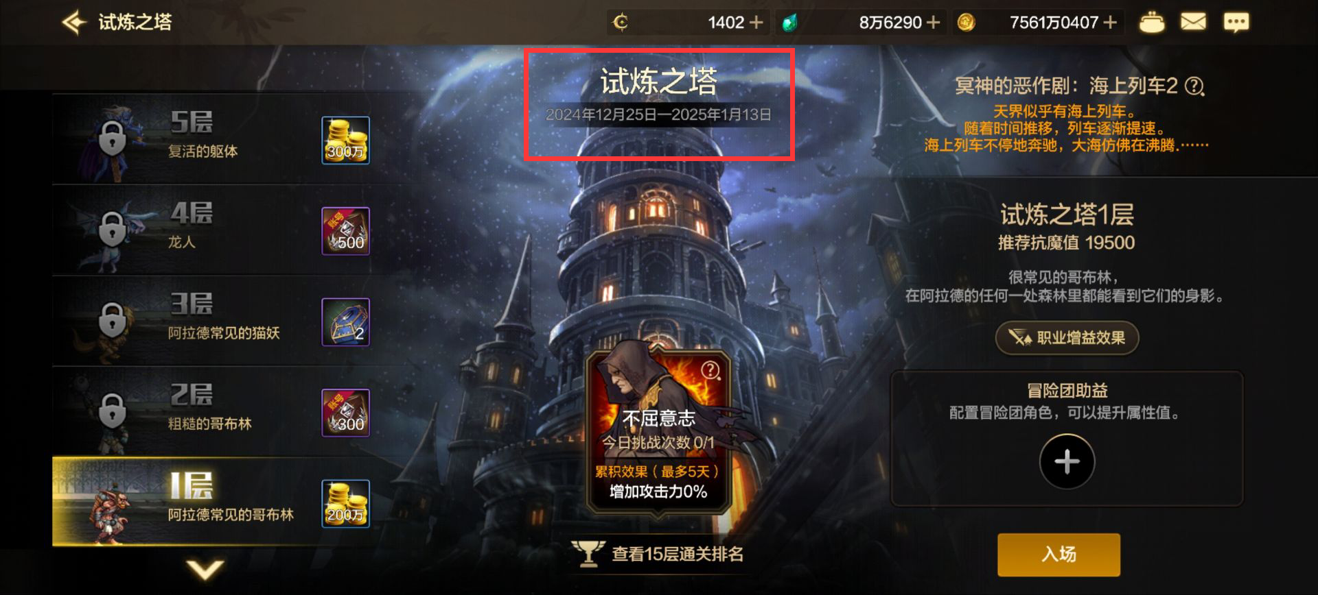 本期试炼之塔的参与时间区间为:2024.12.25~2025.1.13,共计20天时间。