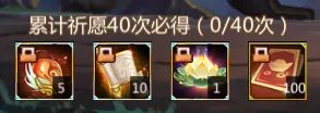 累计祈愿40次即可领取以下所有额外奖励!每次抽奖能获得5点鸿运祝点,可用于前往商城兑换许多珍稀好礼~