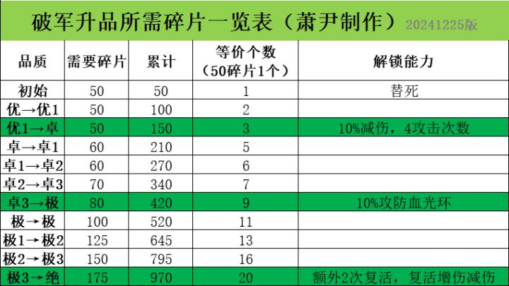 灵兽破军升品所需碎片一览表
