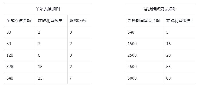 如充值1笔648元,可获取单笔充值25个圣诞礼盒加累充奖励5个圣诞礼盒,共计30个圣诞礼盒