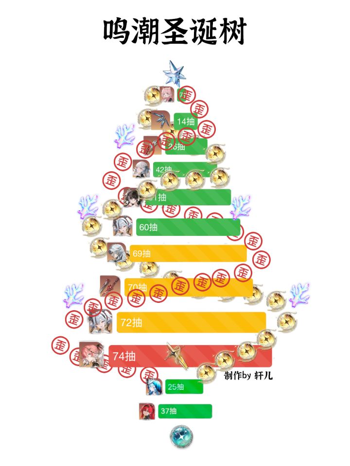 鸣潮公测7个月啦,第一个年头V1.0时代已经接近尾声,借此圣诞节契机为各位鸣潮玩家手搓一颗鸣潮圣诞树,祝愿大家都可以在新的鸣潮V2.0版本中十连三金,全都不歪,也希望鸣潮可以越来越好,我们已经看到鸣潮在2.0版本中的努力,为听玩家声音的项目组点赞!各位潮男潮女们可以在下方晒自己的抽卡哦,或者为新年许愿~V1.0-V1.4我们陆续迎来了25位共鸣者,无论是忌炎吟霖、还是中流砥柱今汐长离、又或是折纸守岸人、还是最近的椿宝里哥,每位共鸣者都给我们带来不一样的故事和感动,带着这些故事与感动去迎接黎那汐塔的朋友们,洛可可、珂莱塔、赞妮、布兰特、菲比,已经迫不及待了~新的一年会为大家继续带来角色培养一图流、声骸推荐、配队各种攻略~