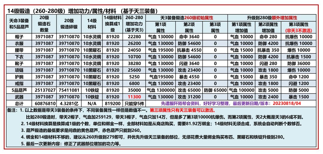 锻造玩法是九阴3D手游中非常重要的一个玩法,从创建角色开始就要开始使用了,1-260级的锻造很简单,260-280级的锻造就不那么简单了,要大乘30级以上的天三装备和需要消耗巨大的锻造石和碎银材料,当然增加的属性也是一个质的飞跃,有条件的必升不可,下面就是280级的锻造属性图
