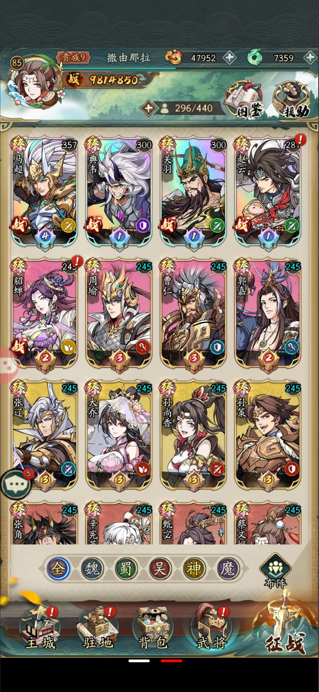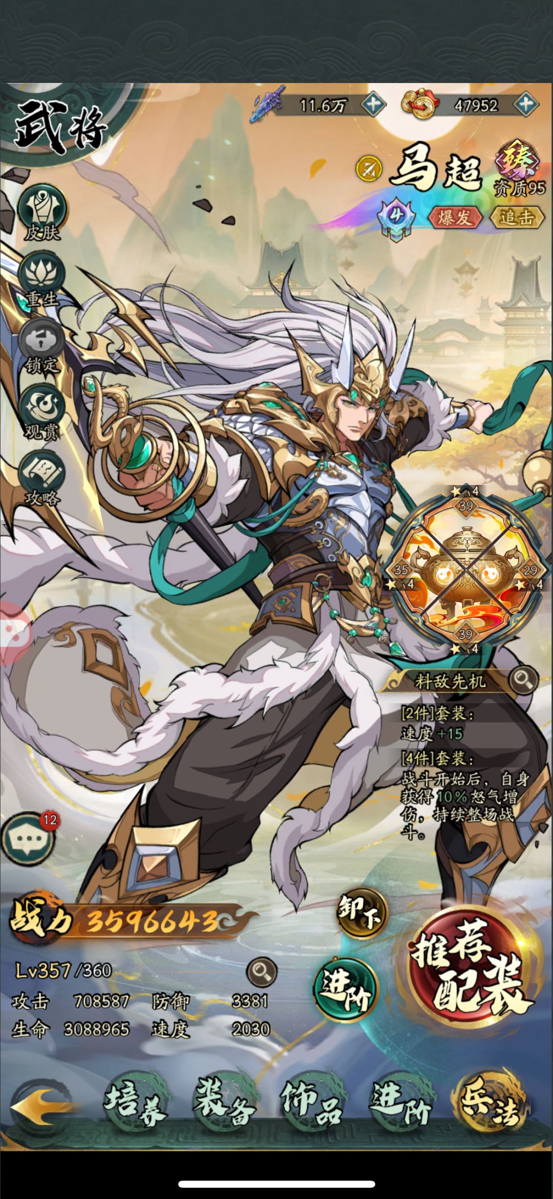 武将搭配:马超可以进入任何组合队伍里百搭,平民前期马超带4个挂件,也就是另外4个武将随便上哪个都行,后期慢慢发展第二个核心