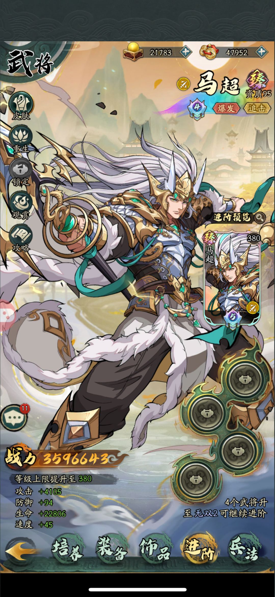 进阶:平民应该是极限到无双4就开始放慢节奏了,无双4到5的前提条件:100个无双之心、4个无双2的武将
