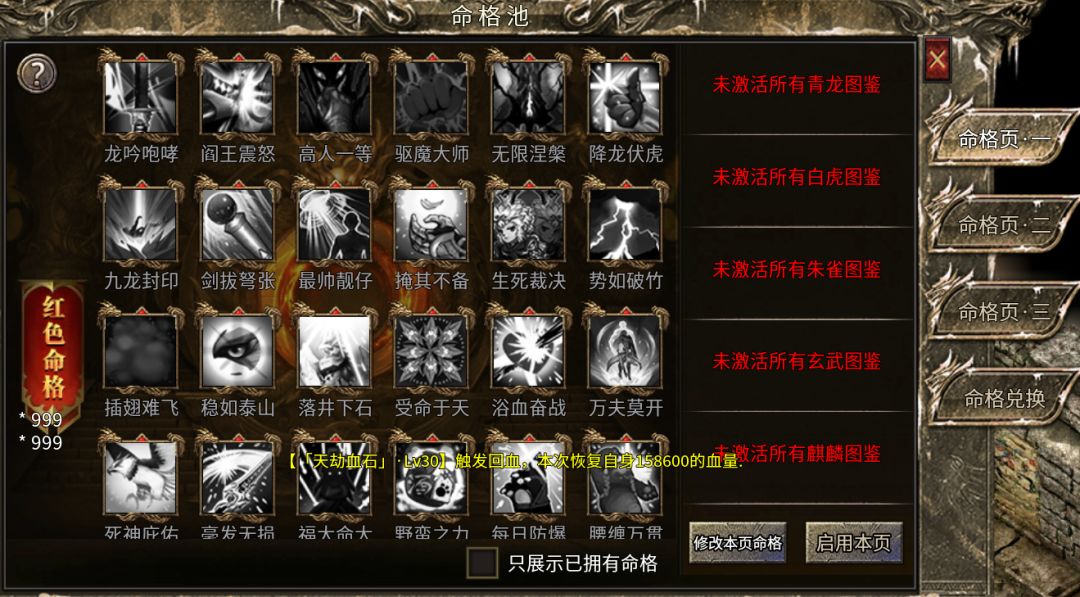 使用无字天书可随机抽命格,选中未激活命格时,激活命格池!