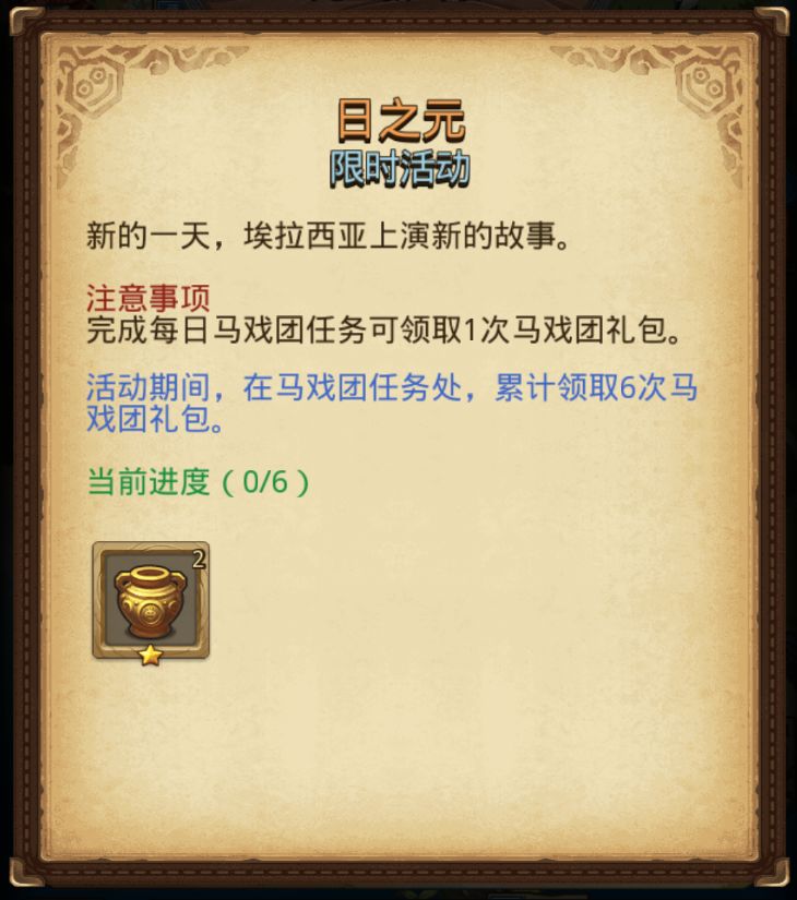 活动期间,在马戏团任务处累计领取6次马戏团礼包